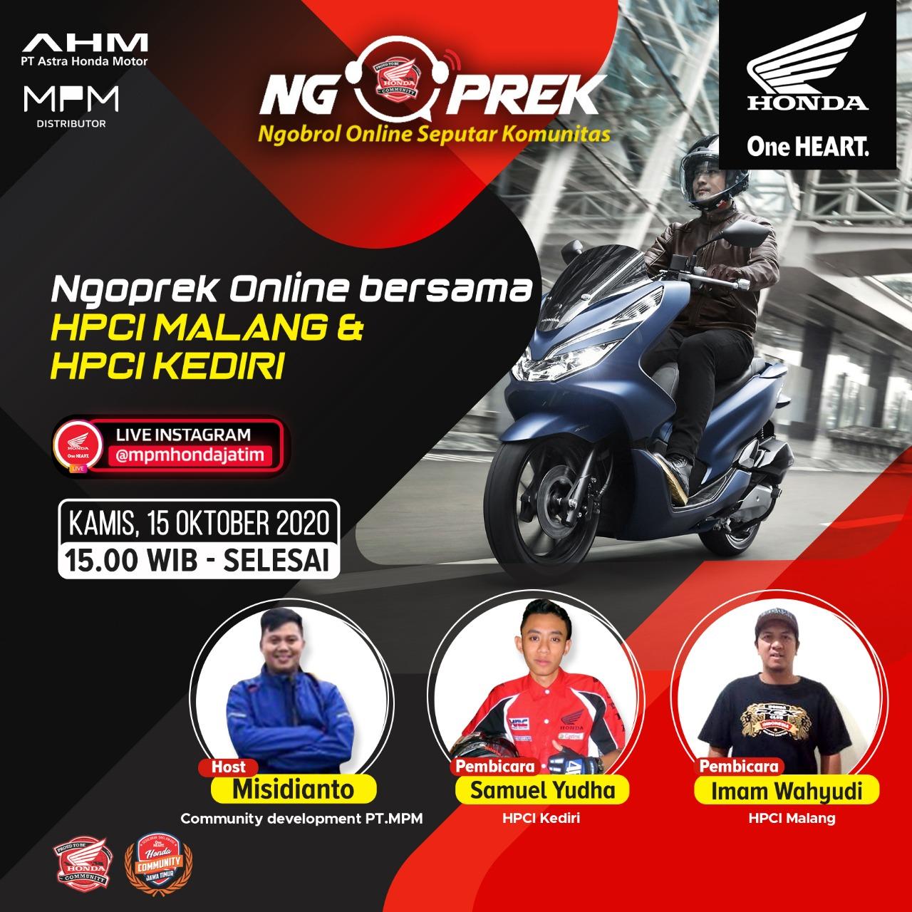 Pada Ngobrol Online Seputar Komunitas (Ngoprek) yang digelar MPM Honda Jatim (16/10) yang live di instagram @mpmhondajatim pembicaranya dari komunitas PCX di Malang dan Kediri. Ada Imam Wahyudi mewakili Honda PCX Club Indonesia (HPCI) Malang dan Samuel Yudha dari HPCI KediriKediri pada acara daring ini.