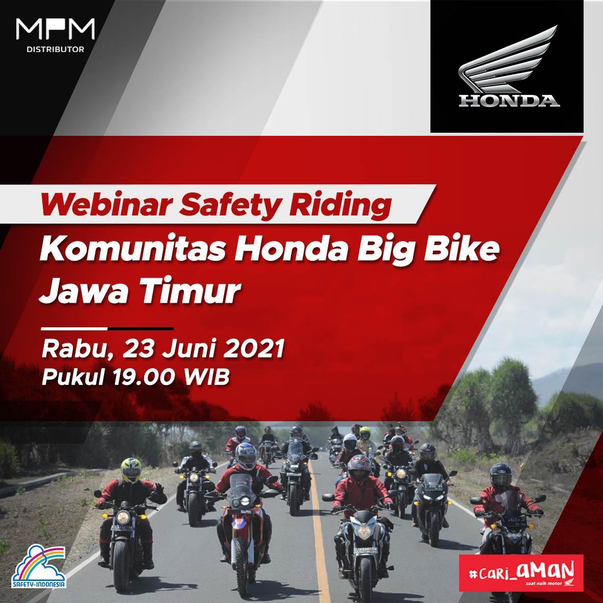 Melalui kegiatan Webinar Safety Riding Komunitas Honda Big Bike Jawa Timur, MPM Honda Jatim mengajak para pemakai big bike di Jatim untuk selalu #Cari_Aman di jalan. Satlantas Polrestabes Surabaya dari dikyasa sebagai nara sumber yang dihadiri Aiptu Firman.