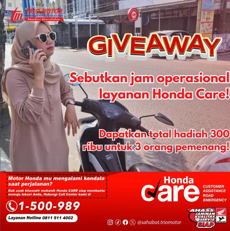 Sebutkan jam operasional layanan Honda Care! Dapatkan total hadiah 300 RIBU RUPIAH bagi 3 orang yang beruntung!