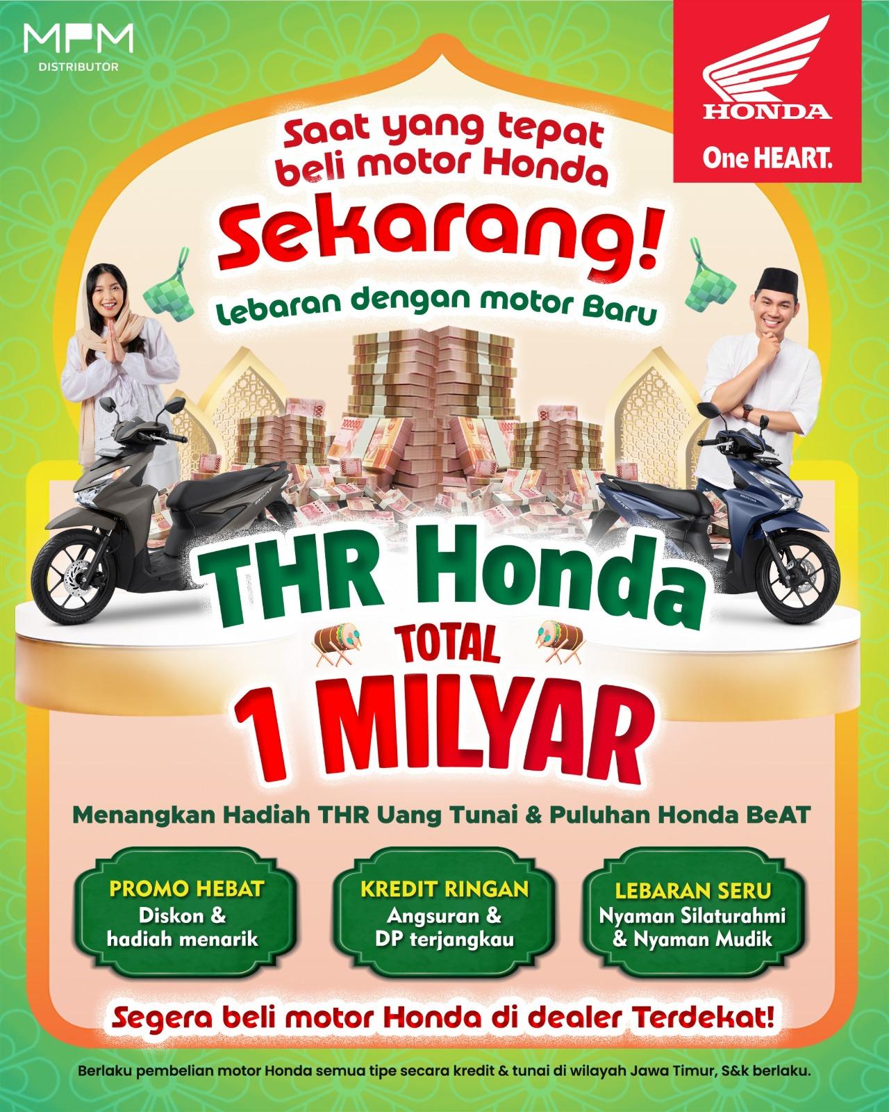 Program THR Honda dengan total hadiah Rp1 miliar, yang diselenggarakan oleh PT Mitra Pinasthika Mulia (MPM Honda Jatim), distributor resmi sepeda motor Honda wilayah Jawa Timur dan Nusa Tenggara Timur, akan segera memasuki periode terakhir pada bulan ini.