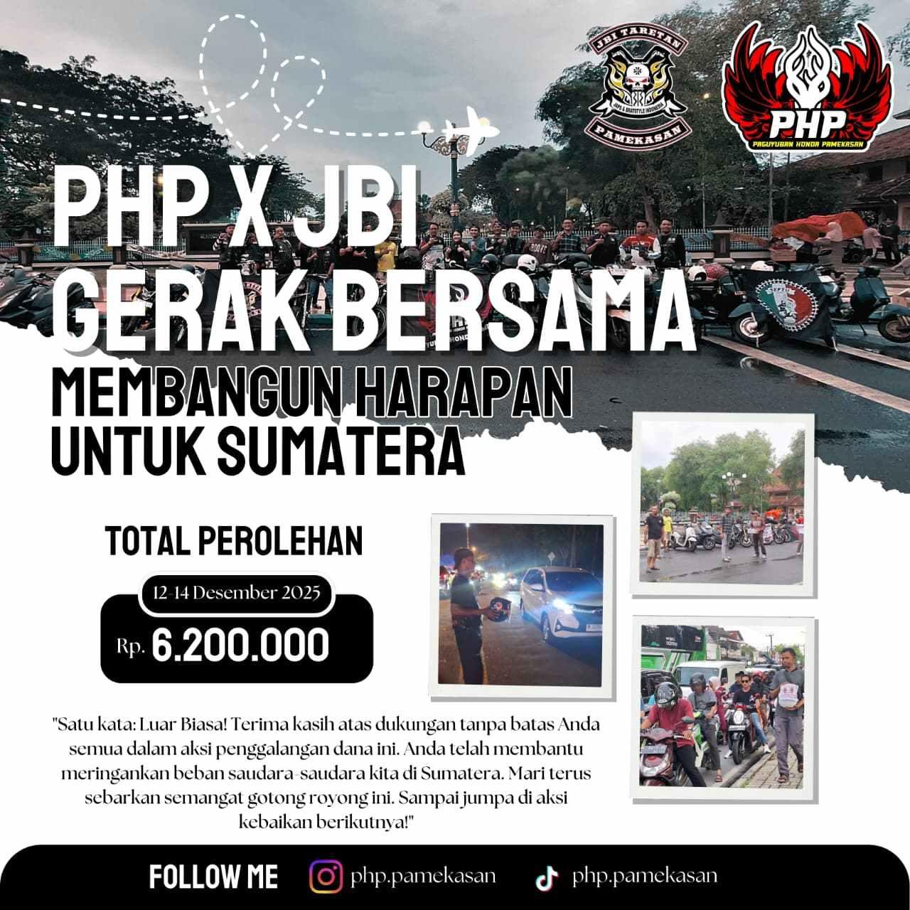 Paguyuban Honda Pamekasan (PHP) kolaborasi dengan JBI TARETAN Pamekasan didukung berbagai komunitas yang ada di Pamekasan laksanakan kegiatan bertema Gerak Bersama Membangun Harapan untuk Sumatera. Aktivitas ini Penggalangan Dana kemudian menyalurkan ke korban bencana di Sumatera 12-14 Desember 2025